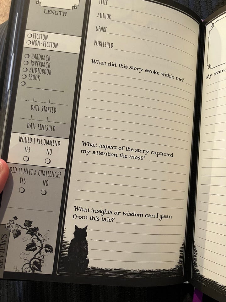 So, I did some reflecting and landed on a guided reading journal. This will be a reading log, but reviews only for favorites or memorable reads. I am letting go the pressure of writing a lot about every book I read. I am still figuring out my reading life as I believe I am in a transition to a new “era” and a guided notebook feels less stressful!