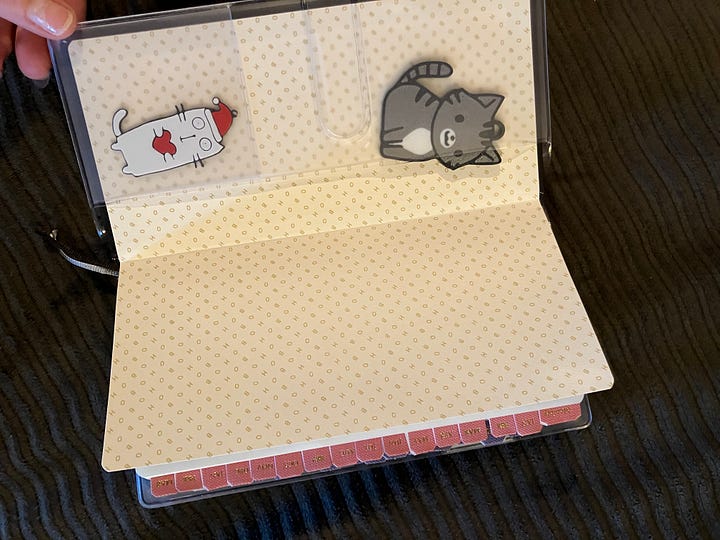 I added tabs for the months to help me flip through, which I’ve never done before. I also purchased a clear cover and it has POCKETS.