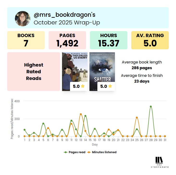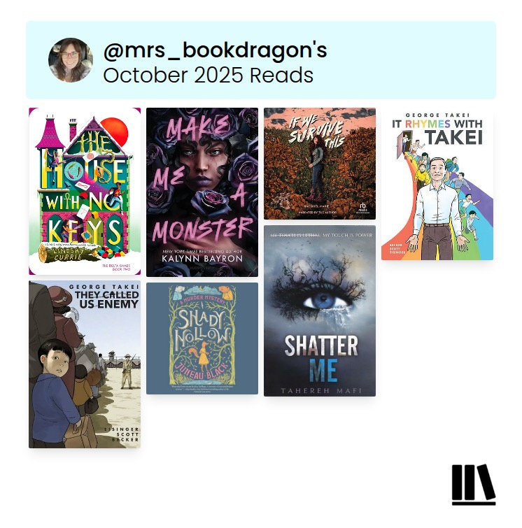 They Called Us Enemy by George Takei: This was a reread and I have to tell you a little of my why for reading it again. I was at my local library looking for graphic novels in the adult section when I came across a copy of this book and was… shocked. It is a middle grade book! Why would it be in the adult section? I battled with what to do, if I should say anything…I decided to read it again to see if there is mature content (even though I was pretty sure there wasn’t). So, I got an ebook copy and dove in. This story is a must read. MUST READ. It covered George’s early years in the Japanese Internment camps that he and his family were placed in during WWII. This is a part of history that isn’t talked about or taught enough about and that is why I think this is a must read. I hope the reason it was in the adult section was due to an error because there is nothing inappropriate in this book. (Ebook)